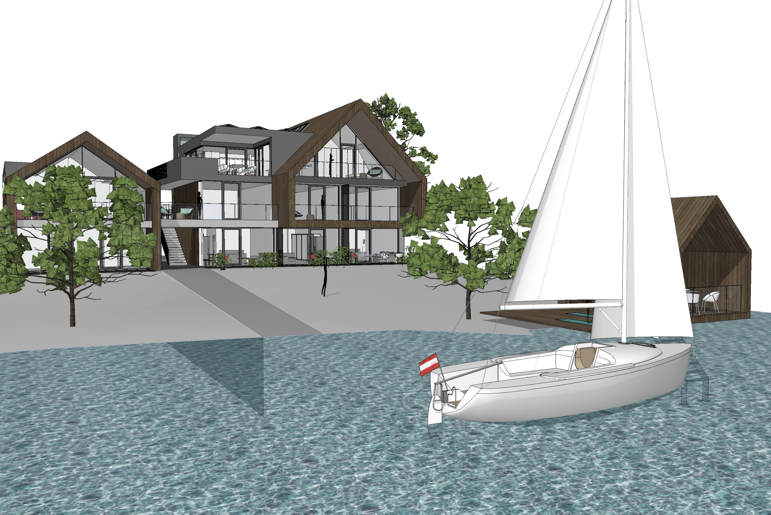 Das Projekt reagiert auf die besonderen Anforderungen des Bauens am Wasser und entwickelt ein zeitgemäßes Gebäude im sensiblen landschaftlichen Kontext.