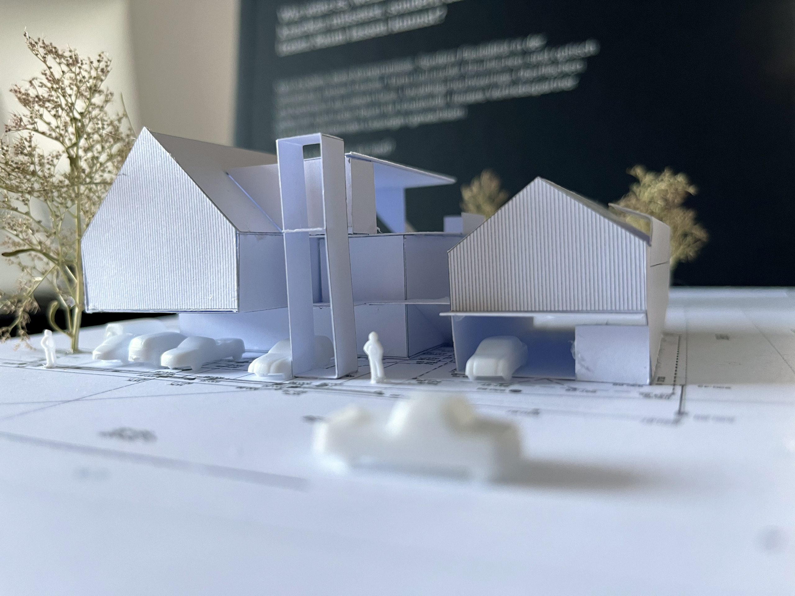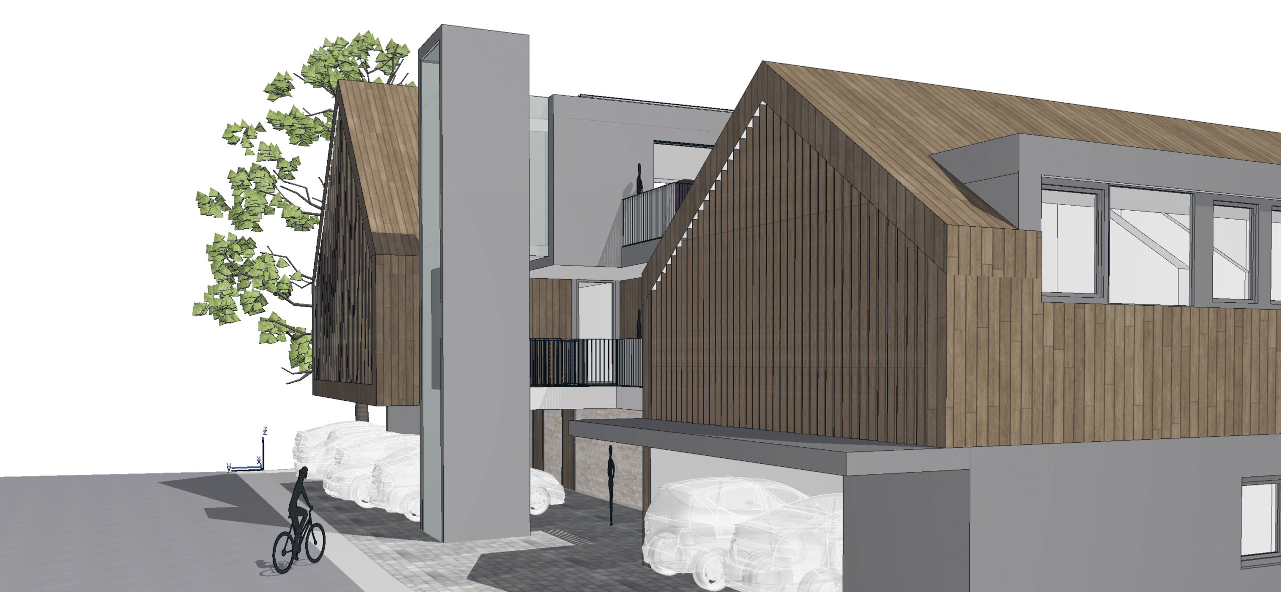 Das Gebäude wird als kompakter Baukörper mit Satteldach ausgeführt.
