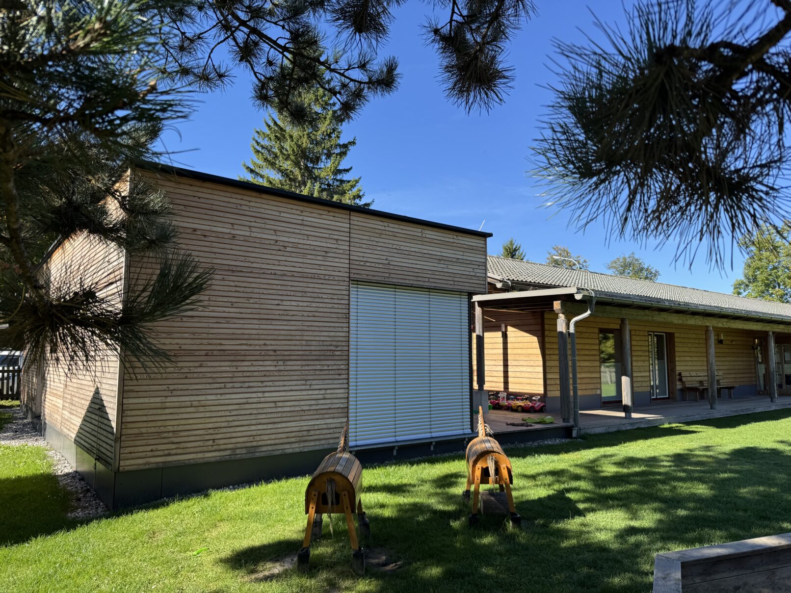 Der Kindergarten Weißensee erhielt einen neuen Gruppenraum, der sich harmonisch an den Bestand anschmiegt und ihn um wertvolle Fläche erweitert. Die Holzbauweise sorgt für ein warmes Raumgefühl, große Glasflächen öffnen den Blick in die Natur und fluten das Innere mit Tageslicht.